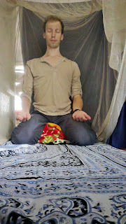 The teacher calls the next six of us up. **He is sitting cross-legged on a chair draped in white cloth. We kneel closely in a line in front of him. Being the foreigner, I get the usual respectful treatment of being addressed first. He bends forwards, motions one hand towards his mouth with his fingers and thumb together, and whispers,